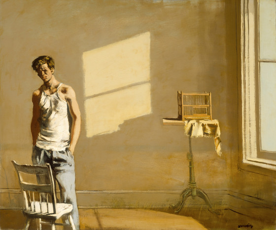 In this painting the extreme contrast in the modeling of the figure is particularly puzzling because the direct light from the window is shown to be striking the wall. A further quality of disquietude and unreality comes from the difficulty the viewer experiences in seeking to identify the subject of Stuempfig’s paintings. Almost always there are figures, typically tough, adolescent males, who stand about idly, lost in their own troubling thoughts, without a relationship of position or action to any other figure or object in the painting. In the museum’s painting this sense of thematic ambiguity is heightened by the familiar surrealist device of the juxtaposition of two conceivably related objects. The viewer must wonder about the relationship between the youth and the empty birdcage resting on an upturned music stand in this painting just as one wonders about the relationship between the similarly posed young man and the isolated houses in Stuempfig’s painting, Two Houses, c. 1940s (Corcoran Gallery of Art, Washington, D.C.). The stiles of the antique chair, behind which the boy stands, establish a visual metaphor for the bars of the birdcage, perhaps hinting at the youth’s spiritual captivity.