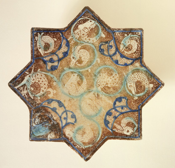 Fritware, overglaze luster-painted with turquoise and cobalt blue