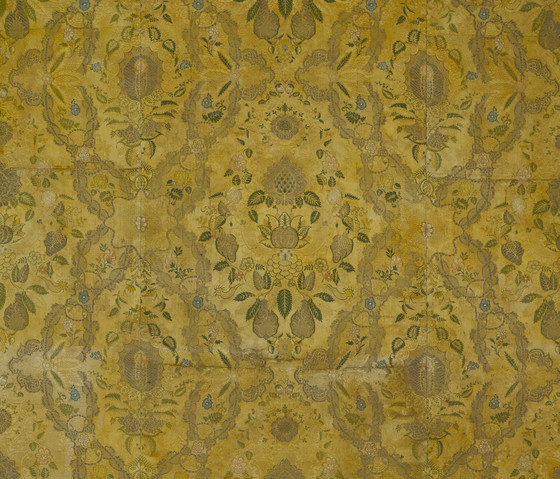 Silk damask with silk and metallic thread supplementary weft patterning, pieced with silk and metallic thread passementiere.