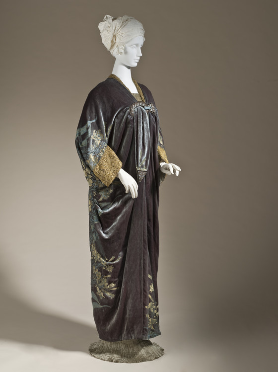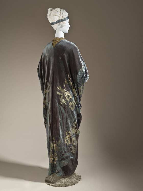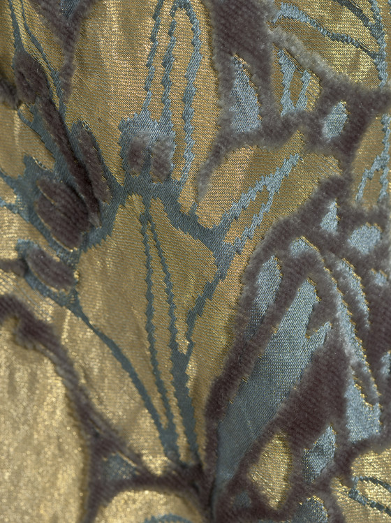 Silk cut and voided velvet on silk and metallic-thread satin ground with metallic lace and jet and glass beads