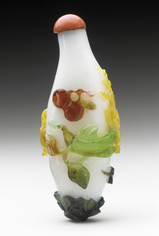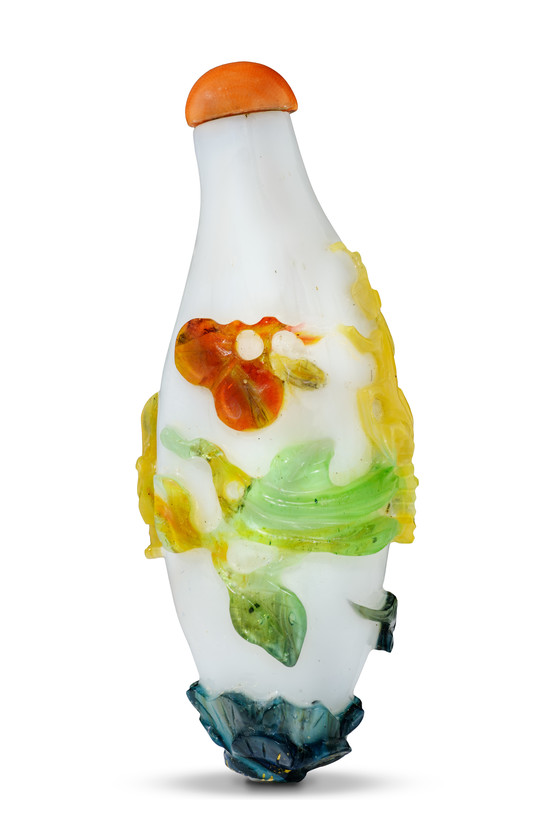 Five-color overlay glass with carved decoration, coral stopper