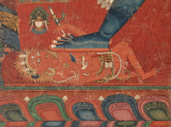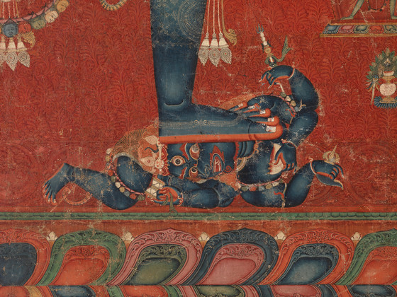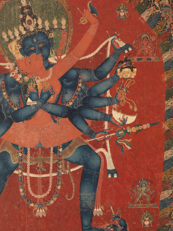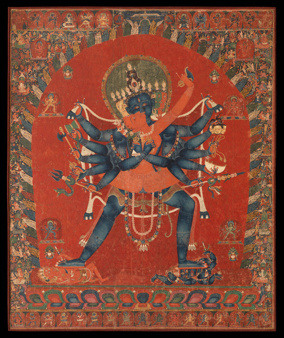 In this finely preserved and exquisitely rendered paubha (Nepalese painting), the central blue figure of Chakrasamvara (The Union of the Wheel of the Elements) symbolizing the blissful state of perfect wisdom) stands in passionate embrace with his red-bodied consort Vajravarahi (The Diamond Sow). They are surrounded by a fiery red aureole, with numerous cremation grounds and the deities who preside over them depicted in the background. The upper and lower registers represent other forms of Chakrasamvara and Vajravarahi, along with numerous other deities.