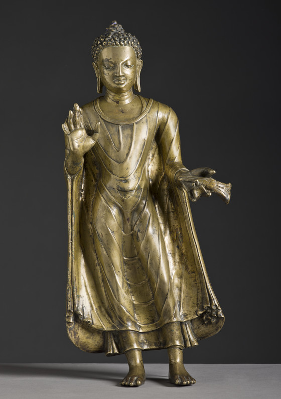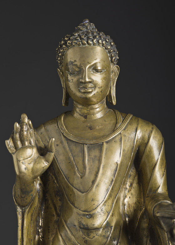 This sculpture was probably made in northern India and was influenced by Mathura and Sarnath styles. The image, long preserved in a Tibetan monastery, received there the dark indigo paint on its locks. The striated, schematic folds of the robe were common to Mathura figures, while its transparency as well as the delicate proportions of face and body and the slight weight shift to the right leg are reminiscent of Sarnath sculpture.