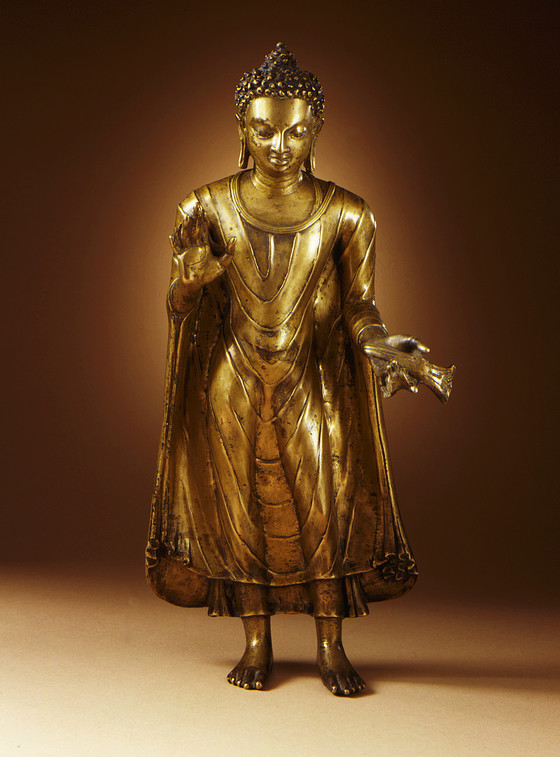 Although the Gupta rulers were Hindu, they actively patronized Buddhism. Kings and devotees gained spiritual merit by pious acts: building temples, commissioning or making images of Buddha, such as this one, or worshiping them. This Buddha embodies two ideals basic to Buddhism, the perfect yogi and the universal ruler. He possesses the yogi's supple, almost buoyant body and contemplative gaze and facial expression, and the ruler's youth, strong shoulders, firm body, and webbed hands and feet. Time-honored traditions of portrayal connect the Buddha's human form with nature; his long eyes are shaped like fish, his curls like snail shells, and the profile of his left shoulder and arm is like the trunk of an elephant.