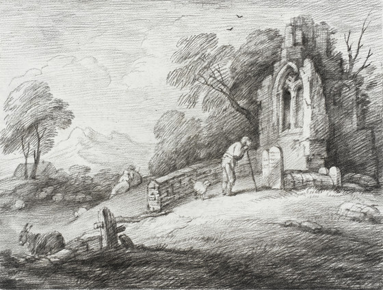A Churchyard with Ruined Tower Among Trees on Rising Ground