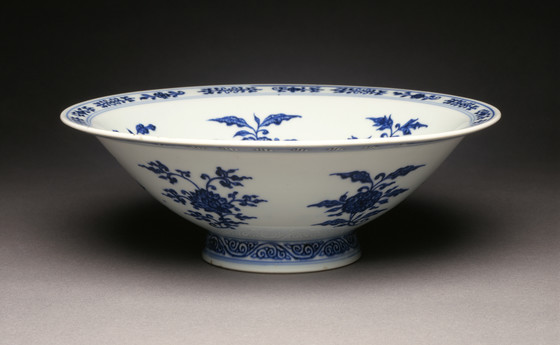 Wheel-thrown porcelain with blue painted decoration under clear glaze