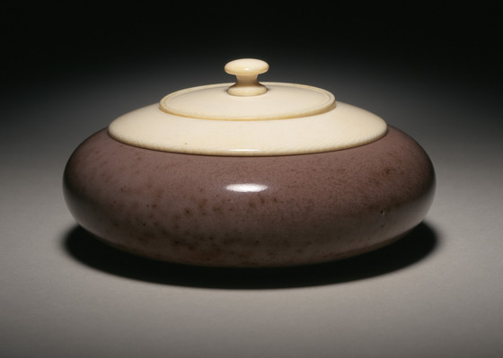 Wheel-thrown porcelain with peach-bloom glaze and carved ivory lid
