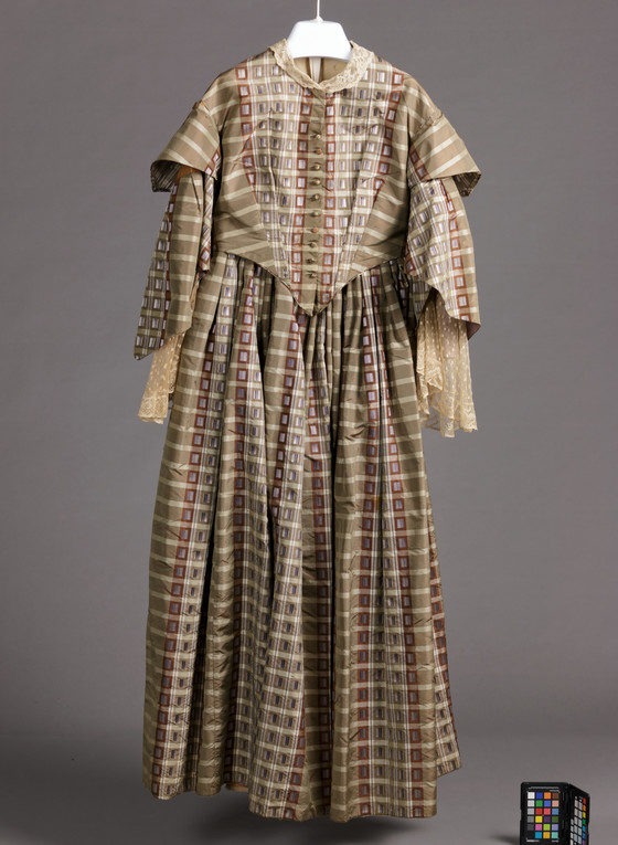 a)Silk plain weave (taffeta) with silk supplementary warp patterning with cotton lace trim
