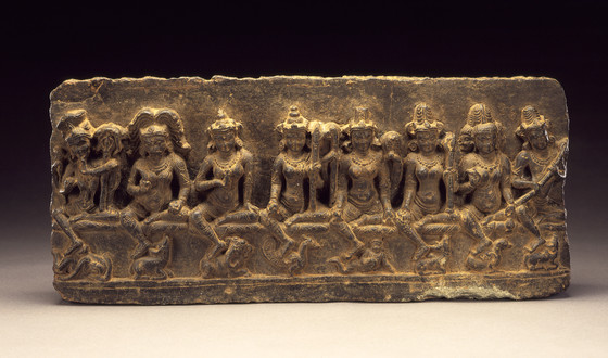 From left to right, the deities represented here are Shiva as Vinadhara, holding a vina and with his bull mount, Nandi; the three-headed Brahmani (Brahma), holding a rosary (akshamala) and ascetic’s water pot (kamandalu), and with her gander (hamsa) mount; Maheshvari (Mahesvara or Shiva), holding a rosary and trident (trishula), and with her bull mount, Nandi; Vaishnavi (Vishnu), holding a discus (chakra), mace (gada), conch (shankha), and probably a lotus bud (padma), and with her half-human, half-avian mount, Garuda; Kaumari (Kumara), holding a lance (shakti) and a fruit (?), and with her peacock (mayura) mount; Indrani (Indra), holding a thunderbolt (vajra), and with her elephant (gaja) mount; the boar-headed (partially damaged) Varahi (Varaha) holding a flaying knife/chopper (kartrika) and skull cup (kapala), and with her buffalo (mahisha) mount; and the four-armed emaciated Chamunda (Durga), holding a skull cup, trident, an undetermined attribute, and displaying the gesture of admonition (tarjani mudra), and with her corpse (mritaka) mount. See also M.80.157.