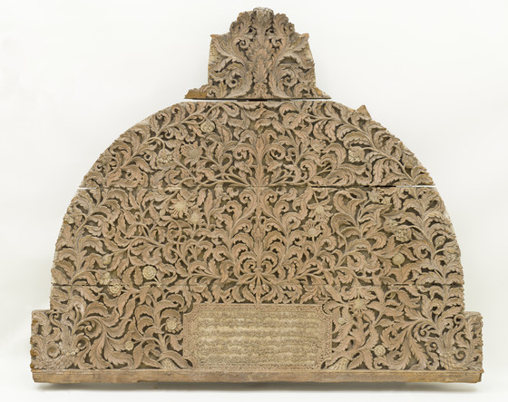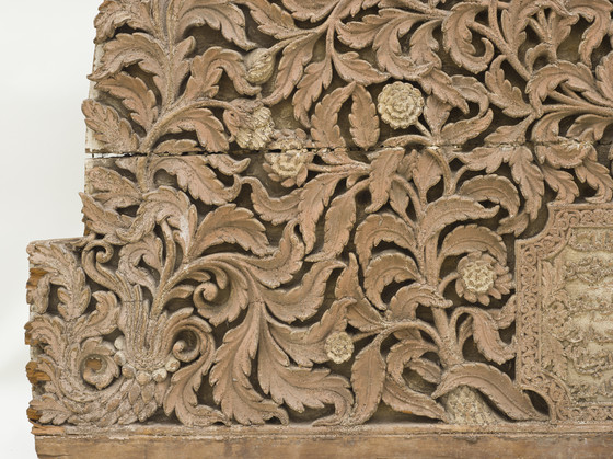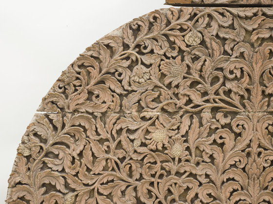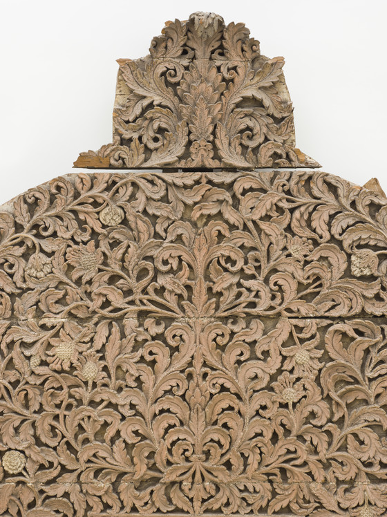 a) Crown piece: 68 x 30 1/8 x 7 in. (172.72 x 76.52 x 17.78 cm); b) Top beam: 13 1/4 x 79 15/16 x 7 in. (33.66 x 203.04 x 17.78 cm); c) Proper left door: 97 1/4 x 28 x 7 in. (247.02 x 71.12 x 17.78 cm); d) Proper right door: 97 1/4 x 30 1/2 x 7 in. (247.02 x 77.47 x 17.78 cm); e) Proper left column: 103 3/4 x 13 1/2 x 8 1/2 in. (263.53 x 34.29 x 21.59 cm); f) Proper right column: 103 3/4 x 13 1/2 x 8 1/2 in. (263.53 x 34.29 x 21.59 cm); g) Base beam: 11 1/2 x 85 1/8 x 6 1/8 in. (29.21
