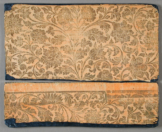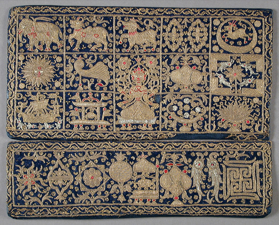 Gold, silver, and silk thread embroidered on silk