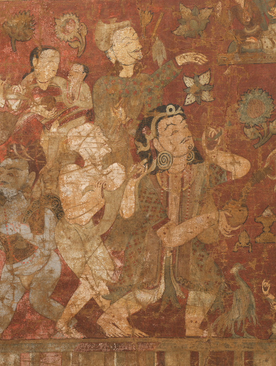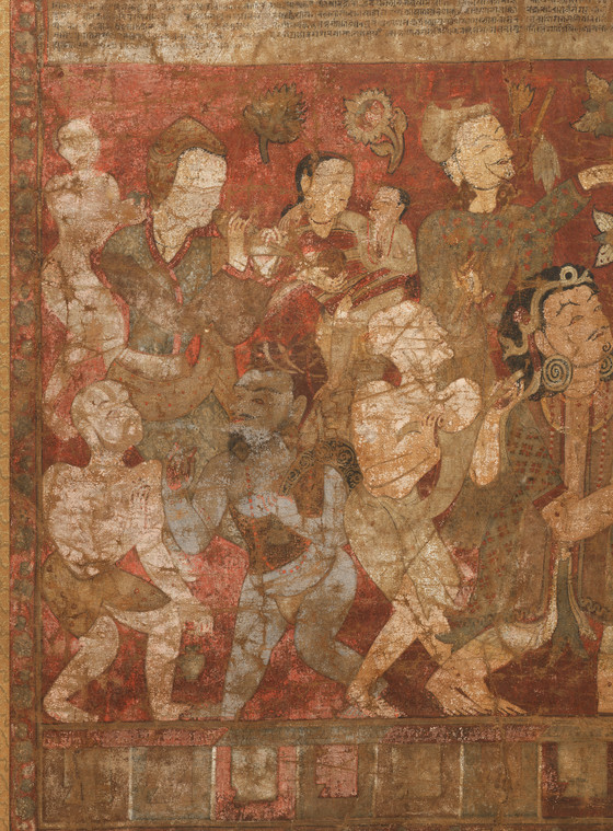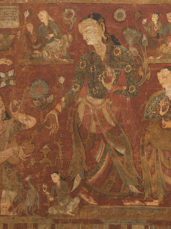 Vanaratna is elegantly depicted with jewelry and luxurious garments and holds a lotus blossom indicating his identification with Avalokiteshvara, the Bodhisattva of Compassion. Despite his mature age of seventy-one at the time of his charitable act, he is shown in an idealized representation in the prime of life, which suggests that this painting was most likely commissioned as a eulogy shortly after his death. The grain flowing from his hands to the ascetics is perhaps meant to symbolize not only his distribution of food as recorded in the painting’s dedicatory inscription but also his offering of profound religious teachings, for which he was famous.