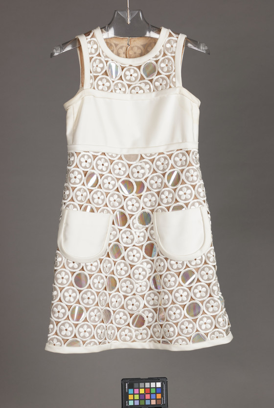 Silk plain weave with silk embroidery and plastic disks, cotton twill, silk knit lining