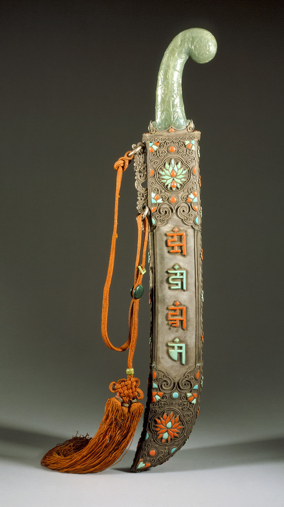 Previously catalogued as Central Tibetan (Pal, 1983 & 1990, pp. 247-248, no. R10), this ceremonial sword and scabbard is more likely Mongolian based on its style of decoration. Ornate swords were indicators of rank and status of male warriors in Tibet and Mongolia, but this sword was probably brandished by priests in Vajrayana Buddhist exorcism rituals to ward off negative forces and attitudes.