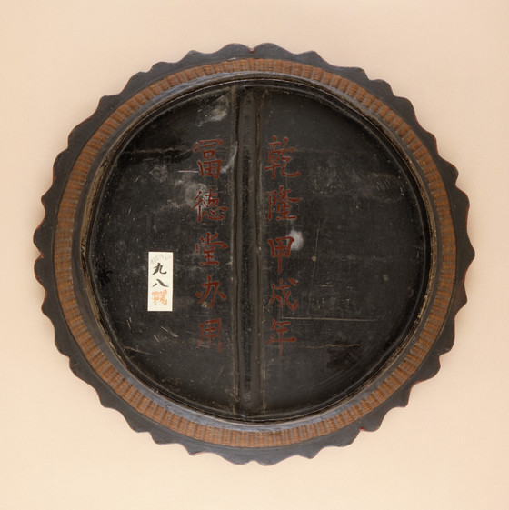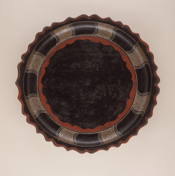 Black lacquer on wood core with mother-of-pearl inlay, wickerwork, and litharge painted (mituo) decoration