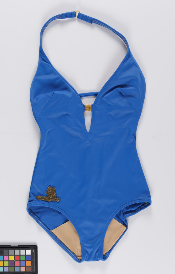 Nylon/spandex knit, with metal ornament and glass bead and crystal applique