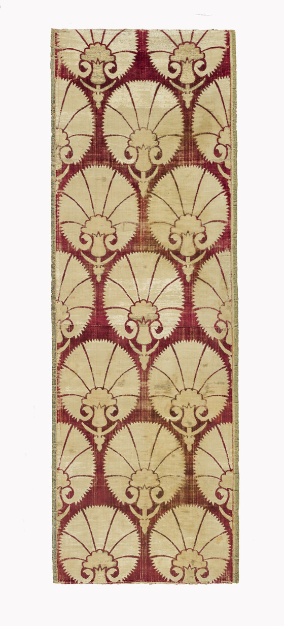 Silk cut and voided velvet on silk satin ground faced with metallic-thread bound in twill