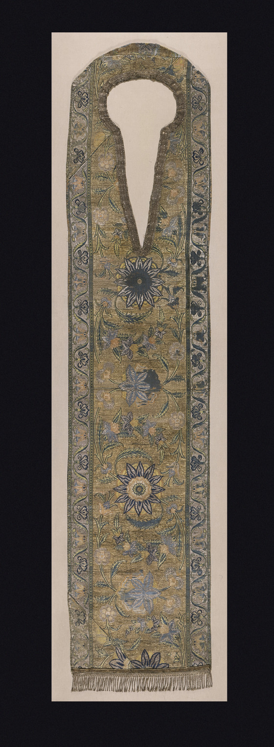 Panel: Silk and metallic-thread satin with silk and metallic-thread supplementary weft patterning bound in twill (lampas), with metallic-thread lace and metallic-thread fringe