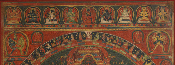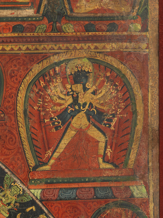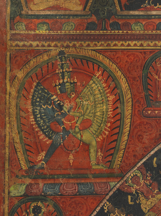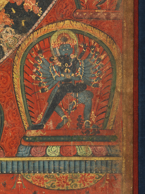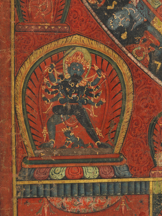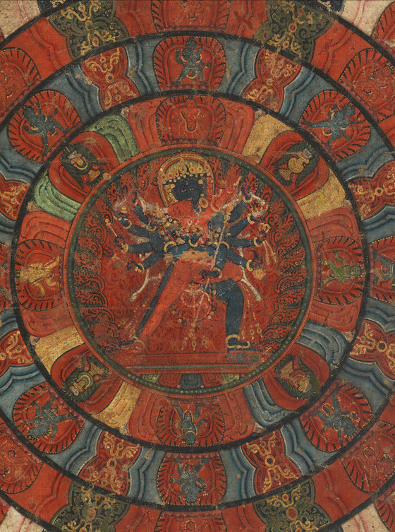 This painting provides a superb example of the fully detailed Chakrasamvara mandala iconography. Chakrasamvara and Vajravarahi are situated at the mandala’s core and a series of concentric circles, signifying the systematic purification of the practitioner’s body, radiates outward. The entire mandala is surrounded by the eight charnel fields, as an environment of renunciation of egoistic craving to prepare the practitioner for meditation.