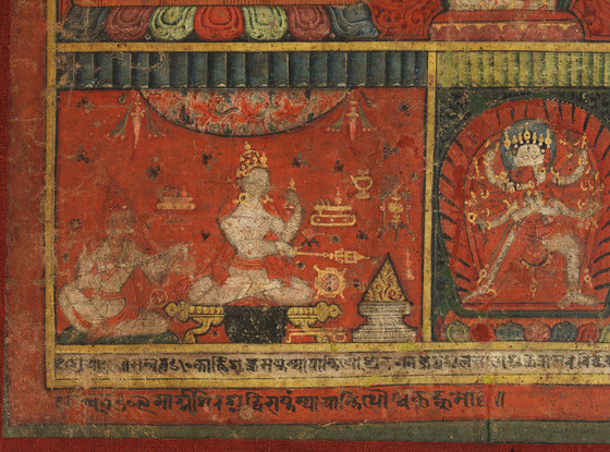 According to the Newari inscription in the footer, the painting was consecrated in 1490 (N.S. 610) during the one-year death-rite ceremony at the request of the donor Vajracharya Jayaraja of Manasu Vihara (monastery) in memory of the death of his father, Vajracharya Uhlasa, who is depicted as a white-haired figure at the lower right. The accuracy with which the scene also represents the priests performing the fire-sacrifice rituals is remarkable, since even in the contemporary context, similar rituals with Vajracharya priests continue to be performed with the same dynamism and vitality of the donors. The second inscription in the lower border states that Uhlasa died in the month of Mansir (December – January) in 1489 (N.S. 609).