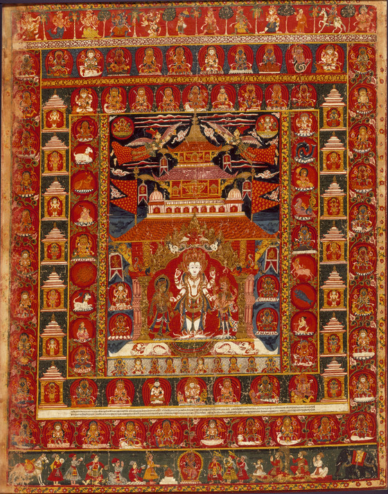 This painting commemorates the performance of the ritual of anantavrata (ceremony in honor of Ananta/Vishnu) in 1681 by King Jitamitramalla of Bhaktapur (r. 1673–96) and his younger brother, Ugramalla. Inside a Nepalese temple Vishnu is depicted in his form of Anantanarayana (the Infinite Lord). The multiple hoods of Ananta, a serpent symbolizing infinity, extend above Vishnu’s head as his coiled body supports him from behind. To the left of Vishnu is his wife, Lakshmi, and to the right stands his half-avian mount, Garuda. The temple floats on the cosmic ocean, which is inhabited by eight demigods representing the treasures of the ocean and two other forms of Vishnu. The top register depicts the ten avatars of Vishnu, and fourteen other images of Vishnu are enshrined.