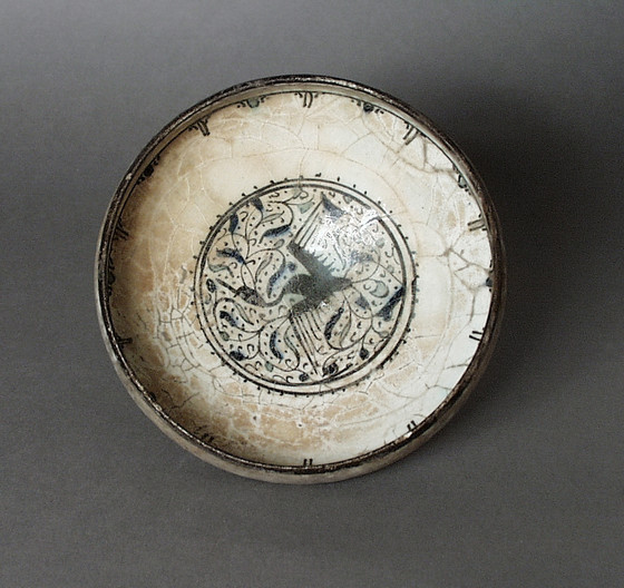 Fritware, white slip, underglaze-painted in black and cobalt blue under a clear glaze