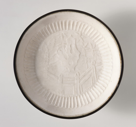 Ding ware, molded stoneware with impressed decoration, white glaze, and banded metal rim