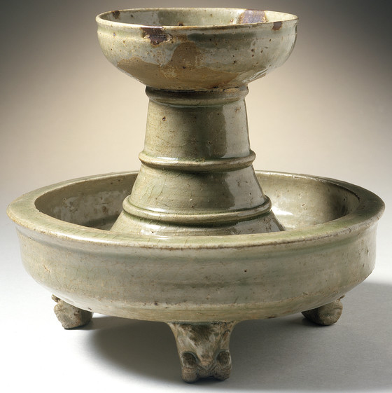 Yue ware, wheel-thrown stoneware with molded and applied decoration and green glaze with brown spots