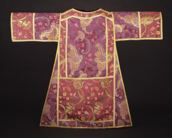 Silk damask with silk and metallic- thread supplementary weft patterning bound in twill (lampas) with metallic braid
