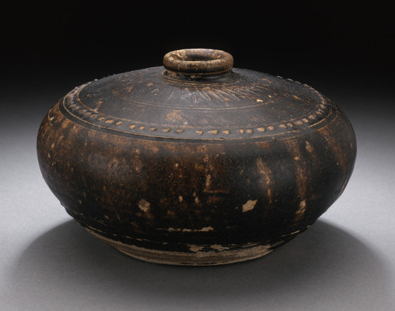 Wheel-thrown stoneware with applied and incised decoration and brown glaze