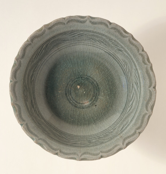 Wheel-thrown stoneware with molded and incised decoration and green glaze
