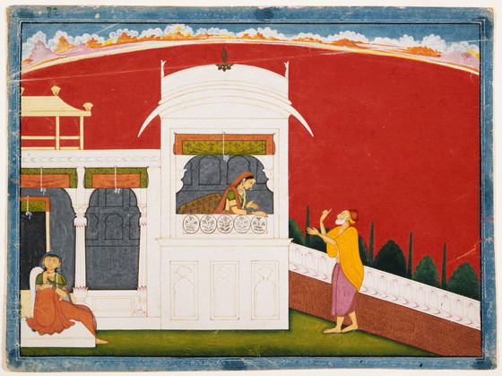 Princess Rukmini Receives a Brahmin with Krishna's Response to her Message, Folio from a Rukmini-Harana (Abduction of Rukmini)