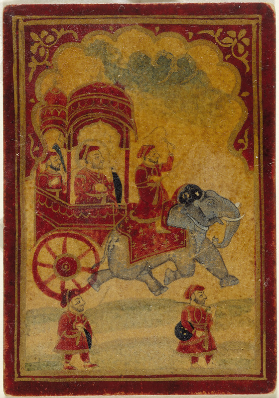A King in an Elephant-drawn Carriage, King of the Ghulam (Slave or Servant) Suit, Playing Card from a Mughal Ganjifa Set