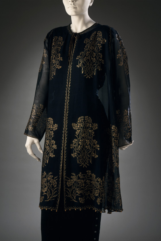 Silk gauze, printed, with wool and metallic thread cord and glass beads
