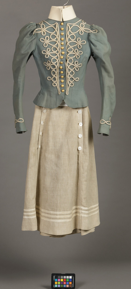 Bodice: wool twill and wool plain weave, fulled, with cotton braid and metal buttons; Skirt: linen plain weave and linen passementerie