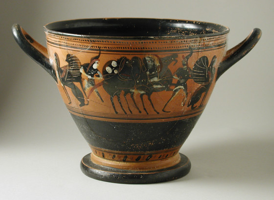 Attic Black-Figure Skyphos with (A and B) Chariot, Amazons and Sphinxes