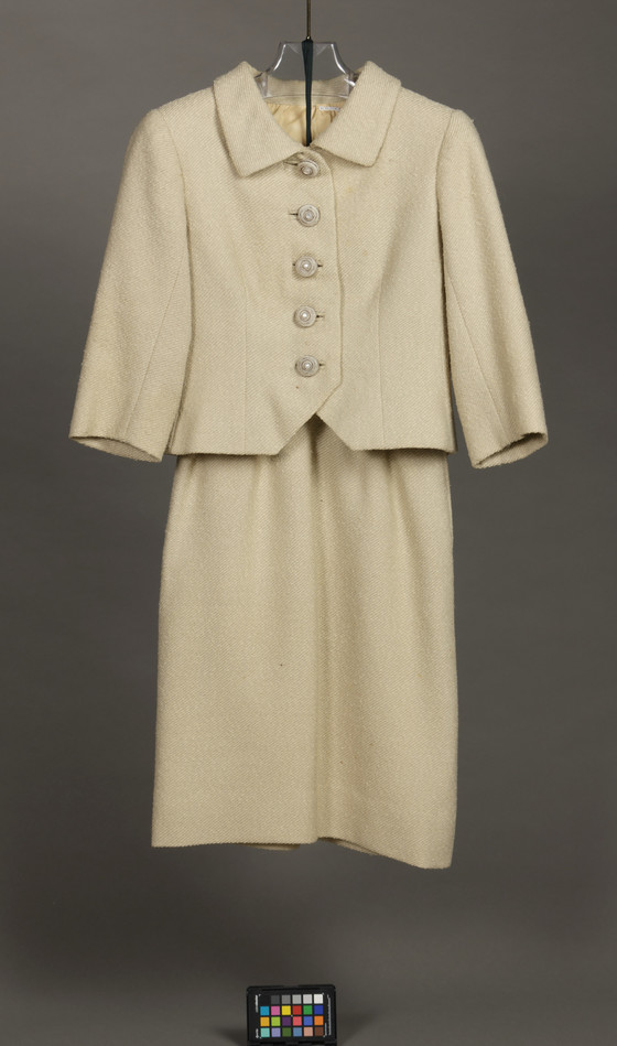 Jacket: wool twill, painted wood and pearl buttons; Skirt: wool twill.