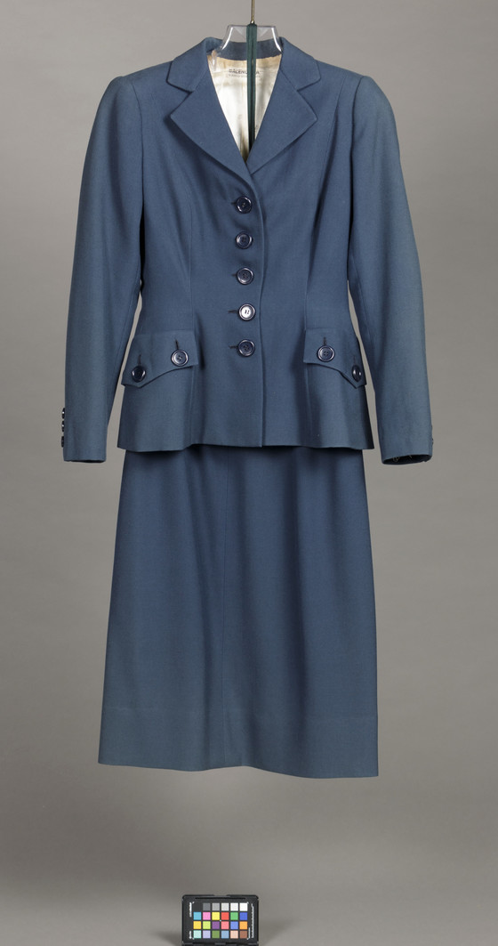 Jacket: wool plain weave with plastic buttons; Skirt: wool plain weave.