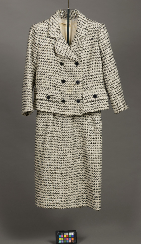 Jacket: wool plain weave, leather and metal buttons. Skirt: wool plain weave.