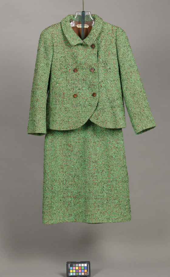 Jacket: wool plain weave, wood buttons. Skirt: wool plain weave.