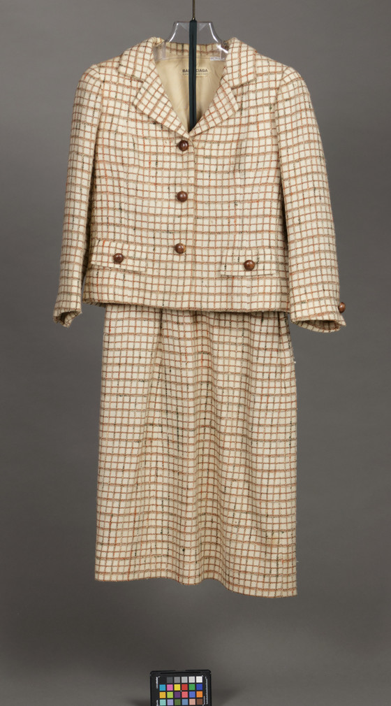 Jacket: wool twill with supplementary warp and weft patterning, with wood buttons; Skirt: wool twill with supplementary warp and weft patterning