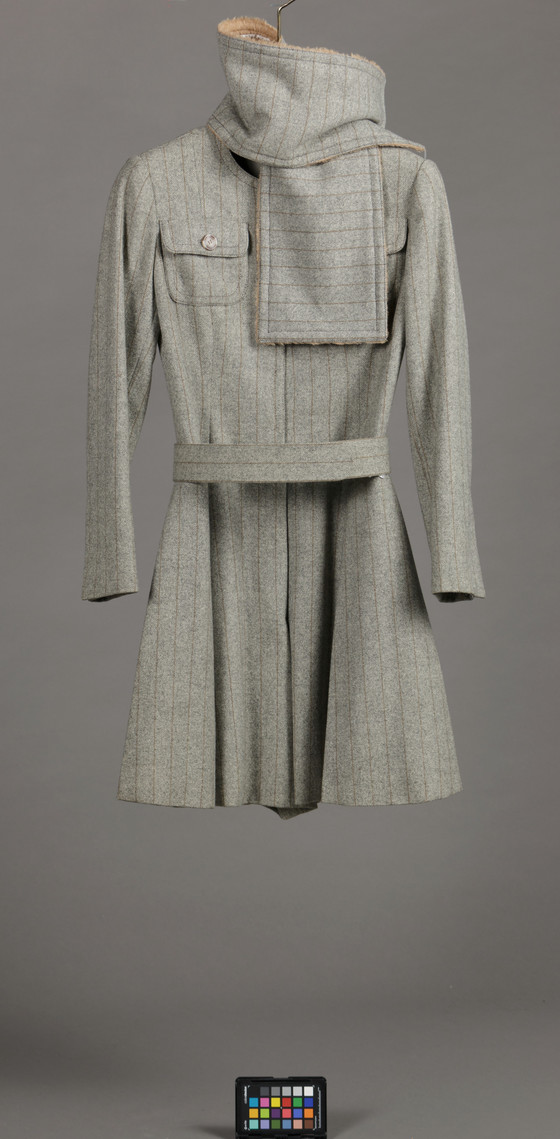 Dress: wool twill; Scarf: wool twill and synthetic mohair