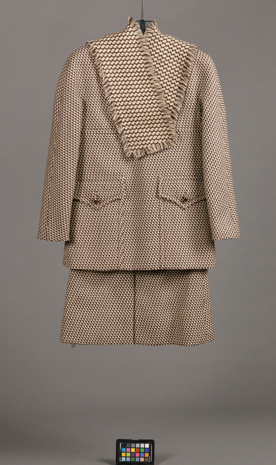 Jacket: Wool twill, wood and metal buttons; Skirt and Scarf: Wool twill