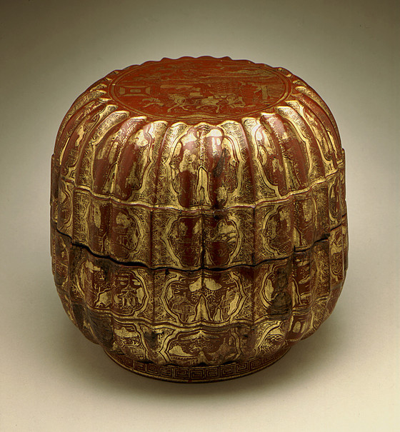 Red and black lacquer on wood core with painted and applied gold leaf decoration (hakue in Japanese)