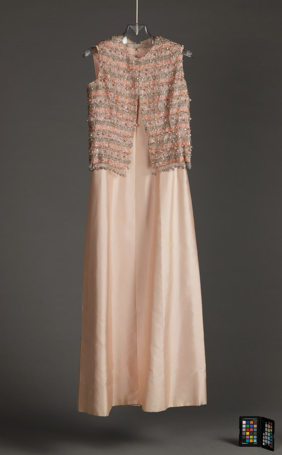 Over-Bodice: silk plain weave with supplementary metallic plastic weft patterning, with silk and metallic thread embroidery, glass beads, silk thread covered beads, and glass seed beads.