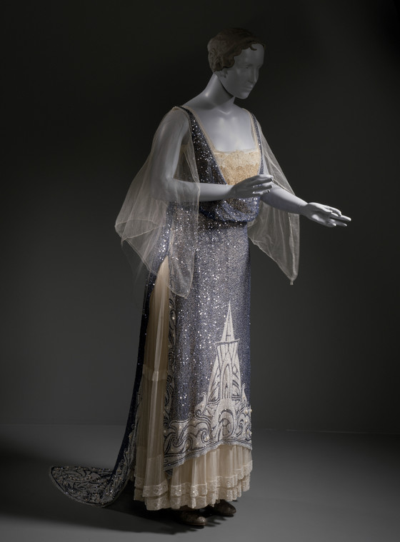 Silk net and silk satin with metal sequins, glass beads, and linen lace