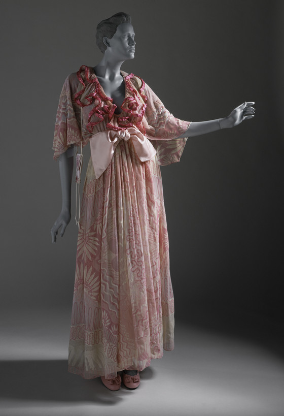 Dress: silk plain weave (crepe chiffon), printed with synthetic twill ribbon and rayon satin