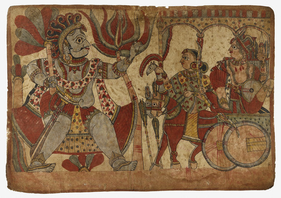 On the Road to Dwarka, Abhimanyu and Subhadra Meet Ghatotkacha, Scene from the Story of the Marriage of Abhimanyu and Vatsala, Folio from a Mahabharata ([War of the] Great Bharatas)