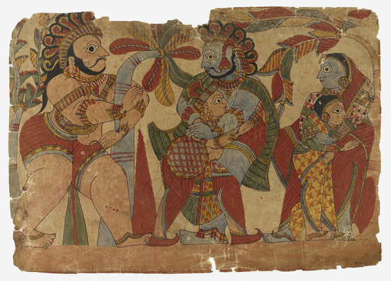 Ghatotkacha Revives and Embraces Cousin Abhimanyu While the Two Mothers also Embrace, Scene from the Story of the Marriage of Abhimanyu and Vatsala, Folio from a Mahabharata ([War of the] Great Bharatas)