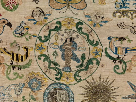 Linen plain weave with silk and metallic-thread embroidery, drawn work, and needle lace